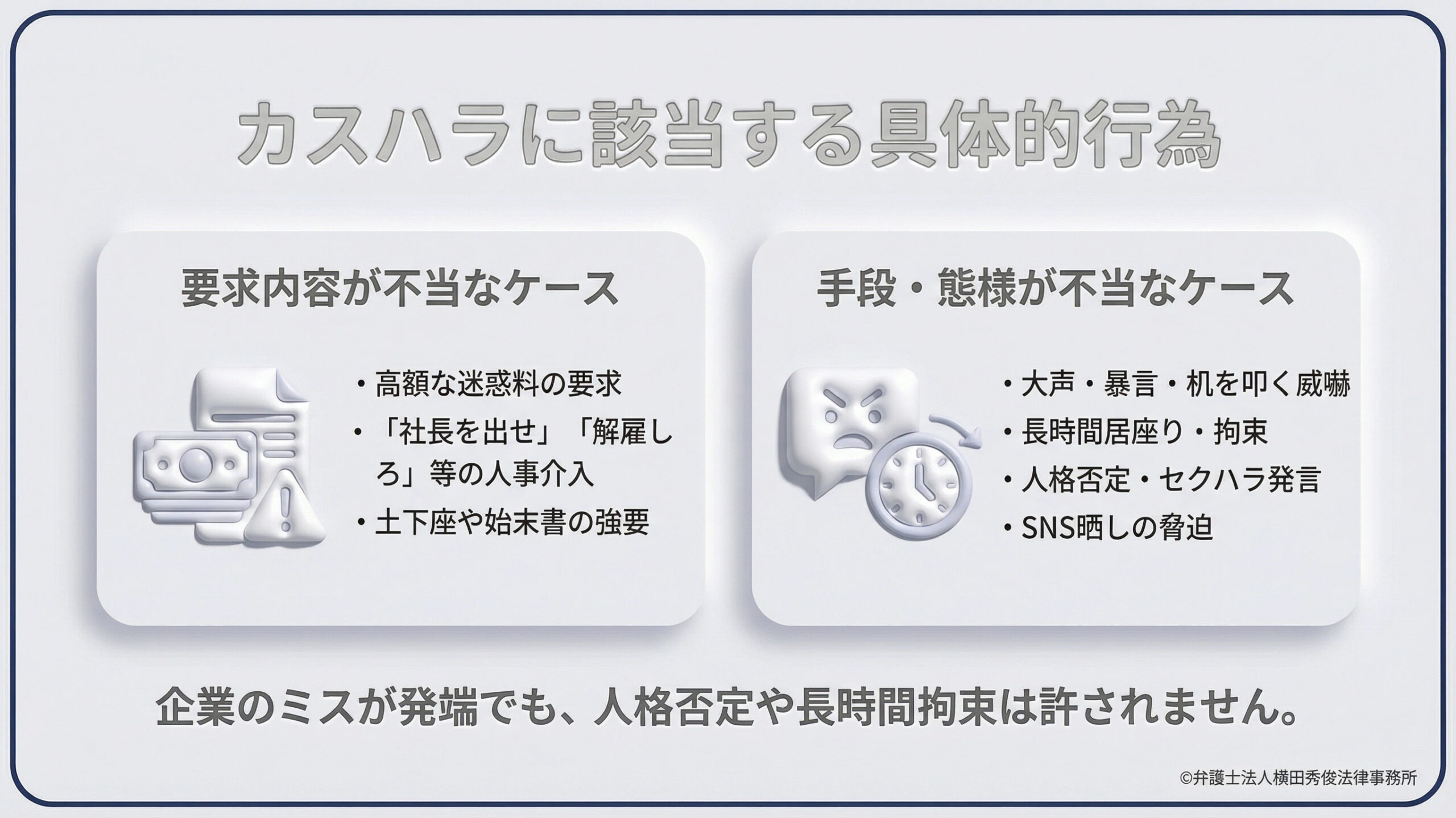 つまり、「言っていることが正しいかどうか」だけでなく、「言い方ややり方が常識の範囲内か」が重要な判断基準となります。たとえ企業のミスが発端であっても、人格否定や長時間拘束が許されるわけではありません。