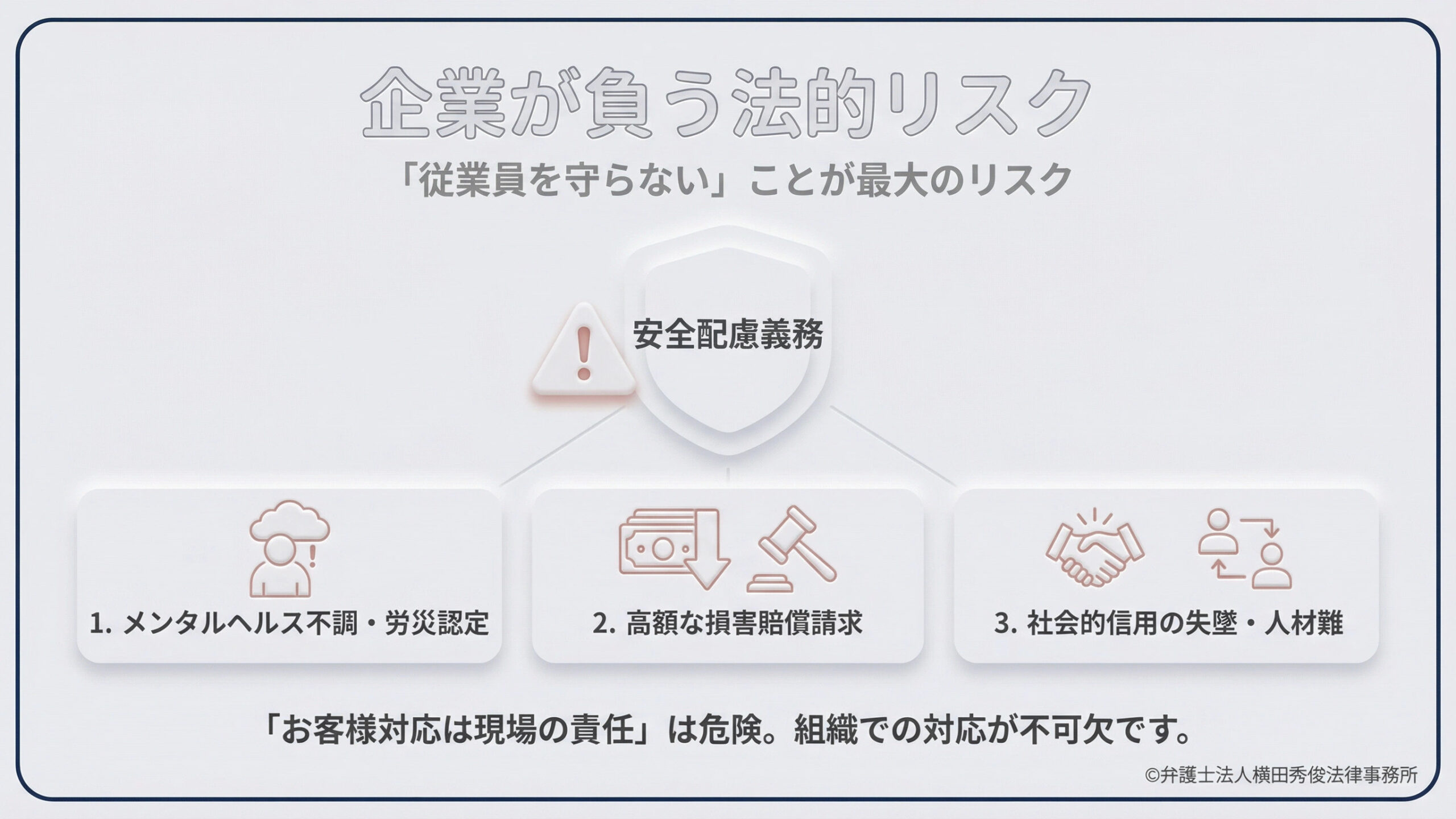 従業員を守る姿勢を見せない企業は、法的責任を問われるだけでなく、社会的信用も失い、人材も集まらなくなるでしょう。