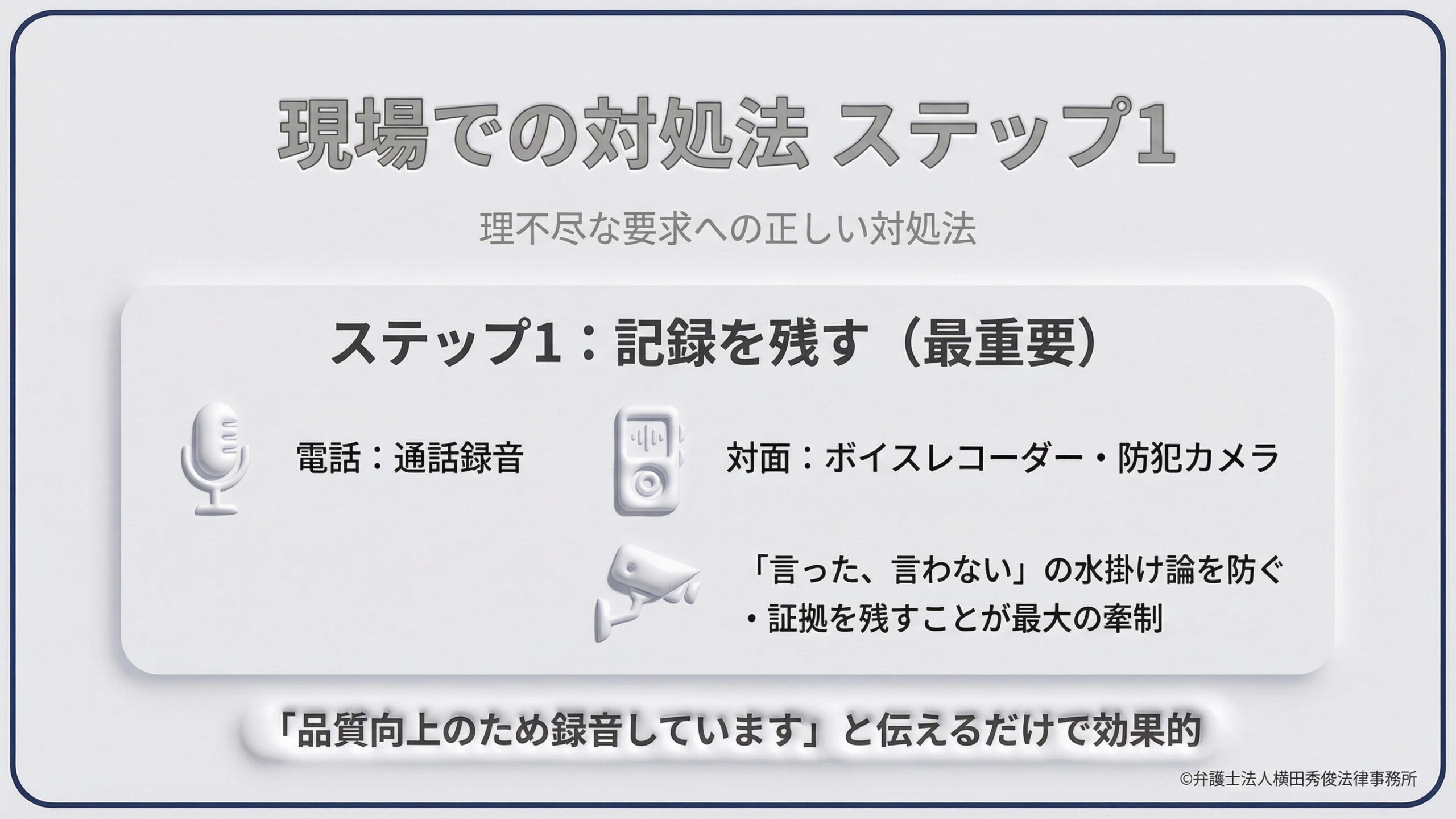 「言った、言わない」の水掛け論にならないよう、証拠を残すことがクレーマーへの最大の牽制になります。最近では「品質向上のため録音しています」とアナウンスするだけで、電話を切るクレーマーもいます。