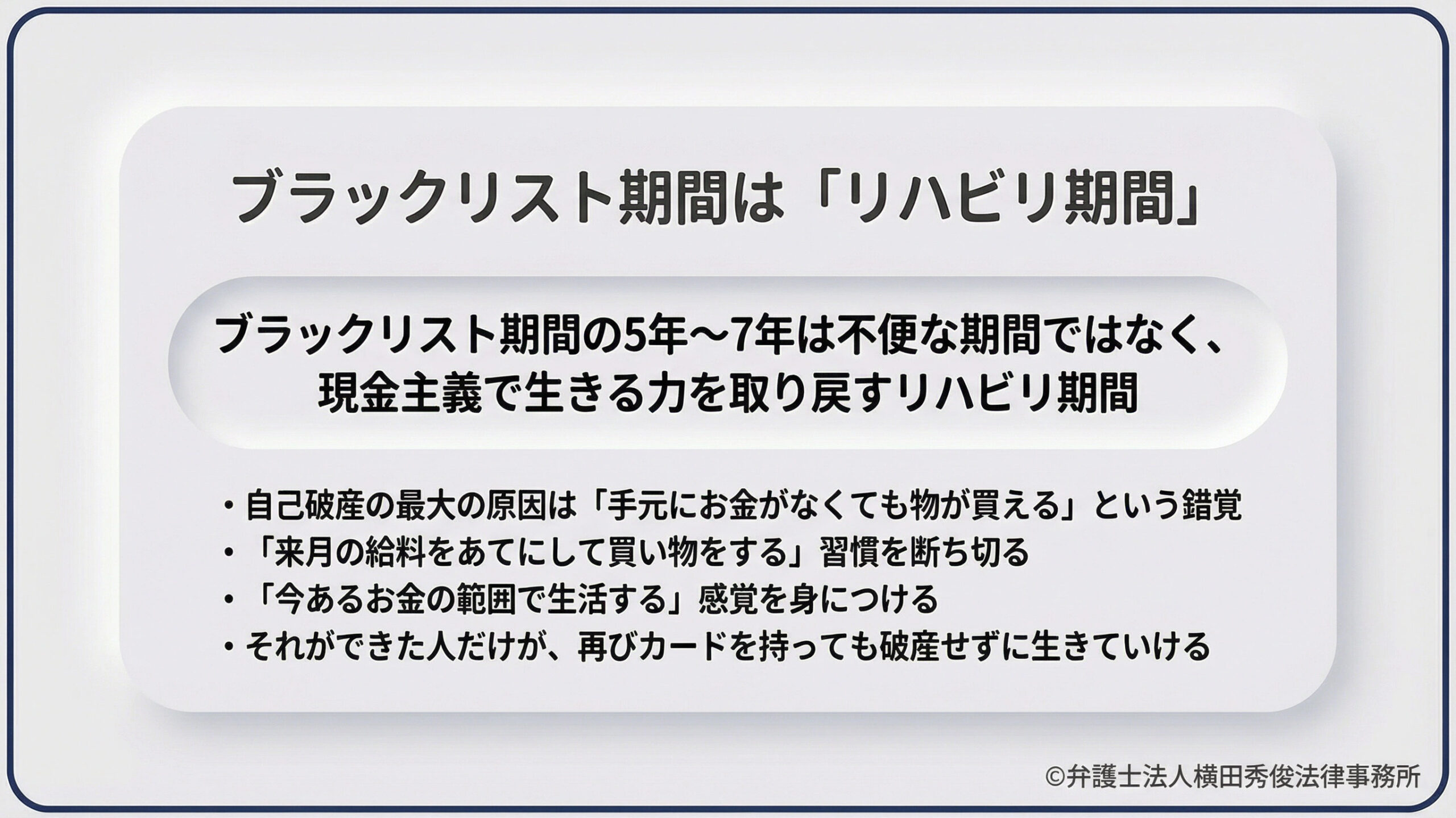 ブラックリスト期間の5年〜7年は、不便な期間ではなく、【現金主義(デビットカード主義)】で生きる力を取り戻すためのリハビリ期間です。