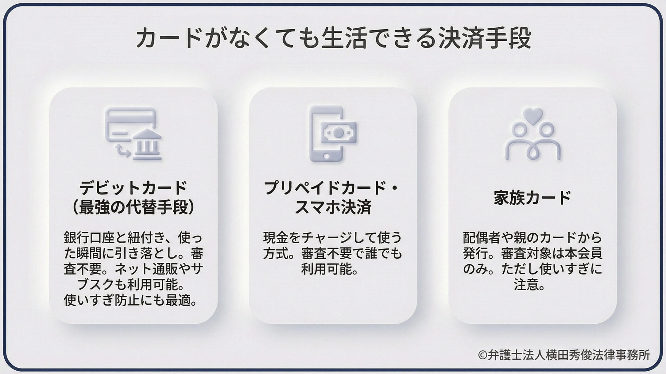 銀行口座と紐付いており、使った瞬間に口座から引き落とされます。「借金」ではなく「自分の預金」を使うため、審査は基本的にありません。