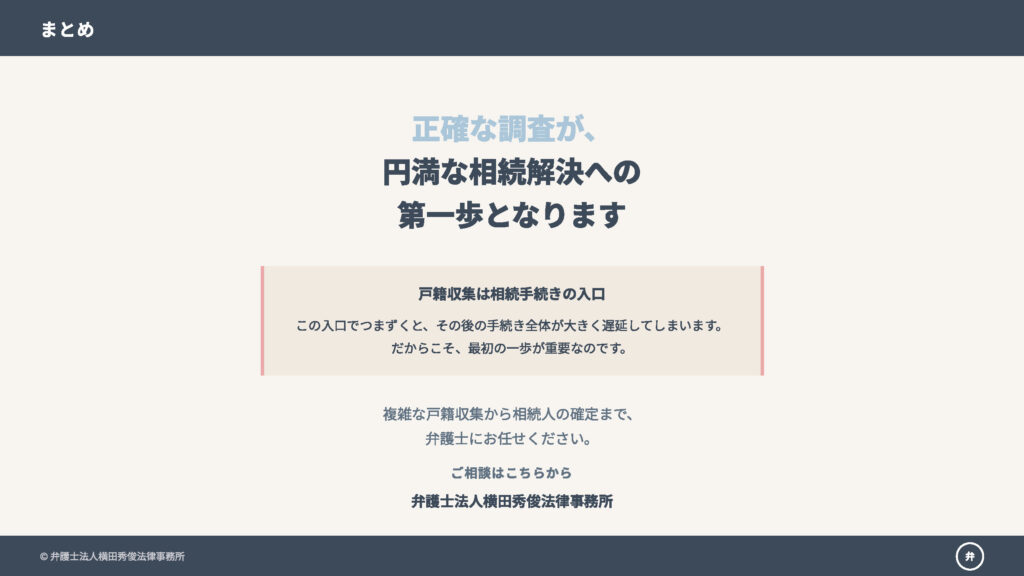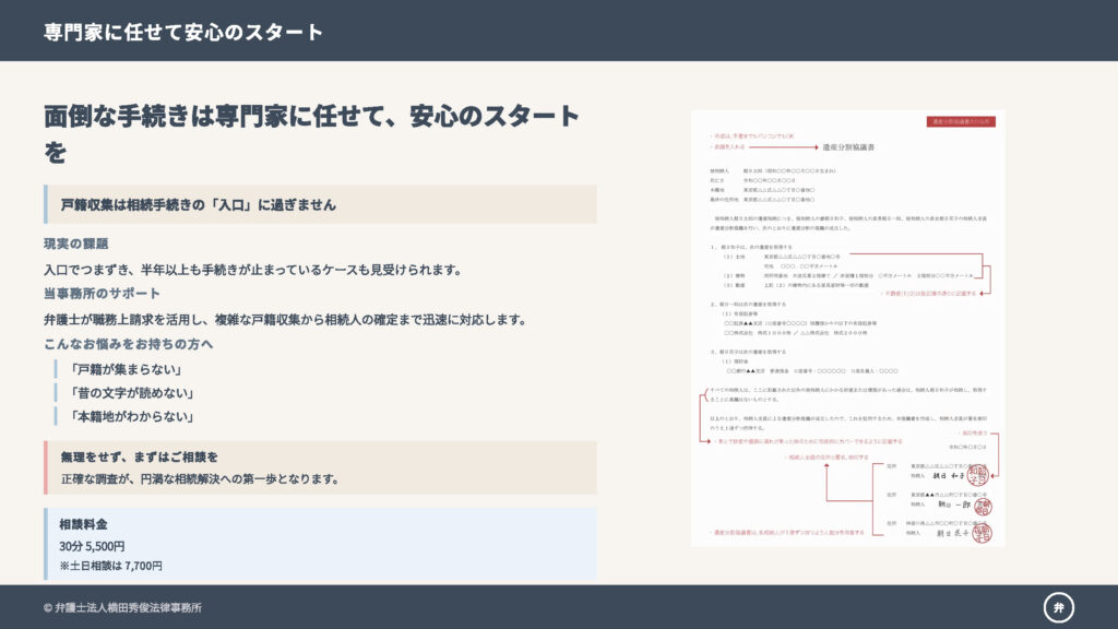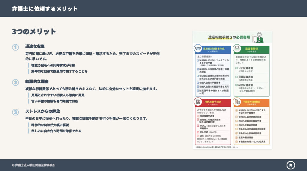 当事務所にご依頼いただければ、弁護士が職務上請求を活用し、複雑な戸籍収集から相続人の確定までを迅速に行います。