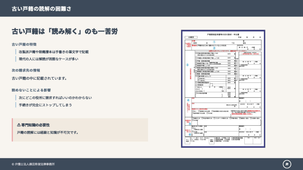 「次にどこの役所に請求すればいいのか」という情報は、その古い戸籍の中に書かれています。文字が読めなければ、次の請求先がわからず、そこで手続きがストップしてしまうのです。