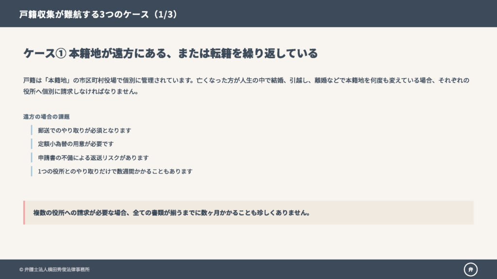 戸籍は「本籍地」の市区町村役場で管理されています。亡くなった方が人生の中で結婚、引越し、離婚などで本籍地を何度も変えている場合、それぞれの役所へ個別に請求しなければなりません。遠方の場合は郵送でのやり取りとなりますが、「定額小為替」を用意したり、申請書の不備で返送されたりと、1つの役所とのやり取りだけで数週間かかることもあります。