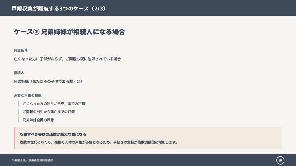 亡くなった方に子供がおらず、ご両親も既に他界されている場合、兄弟姉妹(またはその子供である甥・姪)が相続人となります。この場合、亡くなった方だけでなく、ご両親の出生から死亡までの戸籍も必要となり、さらに兄弟姉妹全員の現在の戸籍も必要となるため、収集すべき書類の通数は膨大な量になります。