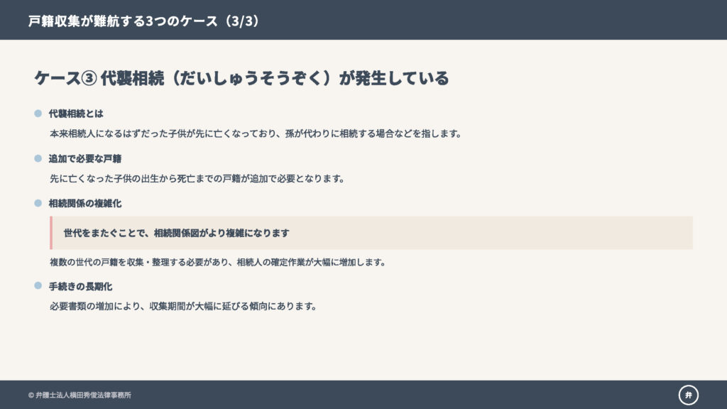 本来相続人になるはずだった子供が先に亡くなっており、孫が代わりに相続する場合などを「代襲相続」といいます。この場合、先に亡くなった子供の出生から死亡までの戸籍も追加で必要となり、関係図はより複雑になります。