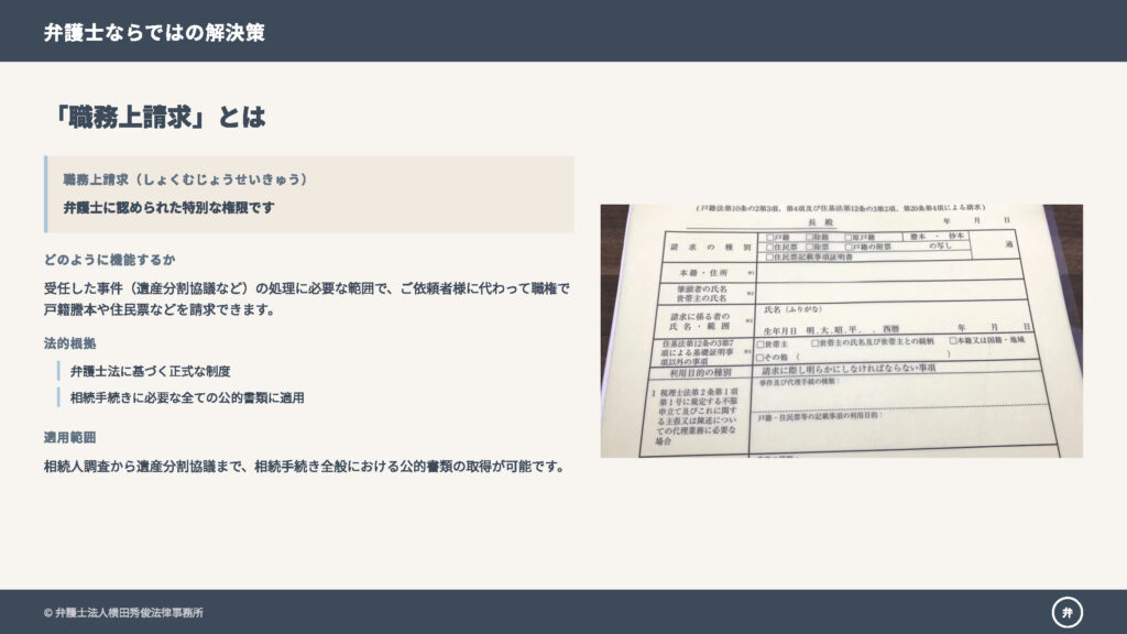 これは、弁護士が受任した事件(遺産分割協議など)の処理に必要な範囲で、ご依頼者様に代わって職権で戸籍謄本や住民票などを請求できる制度です。