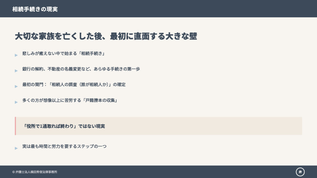 大切なご家族が亡くなり、悲しみが癒えない中で直面するのが「相続手続き」です。預貯金の解約や不動産の名義変更など、あらゆる手続きの第一歩となるのが「相続人の調査(誰が相続人か)」ですが、ここで多くの人が最初の大きな壁にぶつかります。